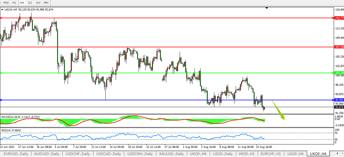4小时图看:短线价格持续弱势下行,中期图形结构转空头,适合逢高滚动沽空, MACD量能柱0轴下小幅放量,RSI小幅走弱,短期油价反弹后继续下行概率较大。