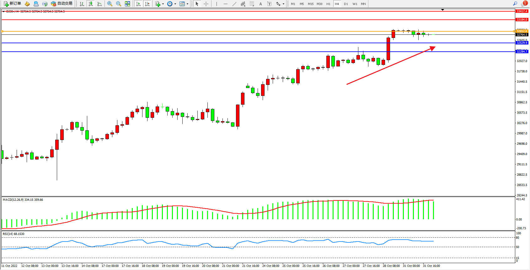 道琼斯指数10月31日(周一)收盘下跌128.85点,跌幅0.39%,报32732.95点;受美联储激进加息前景影响。谨慎的投资者关注美联储即将召开的政策会议,以寻求其未来政策立场指引。委员会似乎尚未就12月份加息的首选规模达成共识。