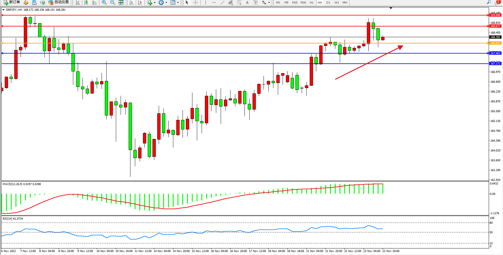 英镑兑日圆维持168.281附近震荡,OECD对2022年至2024年英国经济增长幅度的预测与独立的英国预算责任办公室(OBR)类似,但它预计明年将出现0.4%的温和衰退,但后年将出现0.2%的增长,而英国预算责任办公室预计英国经济将出现更深的衰退和更强劲的反弹。
