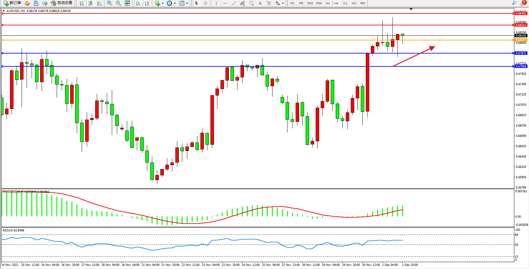 澳元美元AUDUSD——4小时K线图显示: