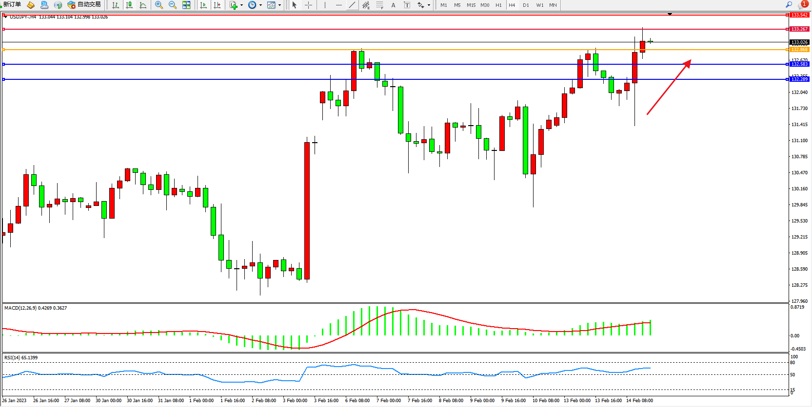 4小时图看:多头动力高位震荡上扬,市场多头情绪涌现,短期有继续向上移动态势,MACD指标处于多头区域维持整理,RSI指标处于多头区域缓慢上行;