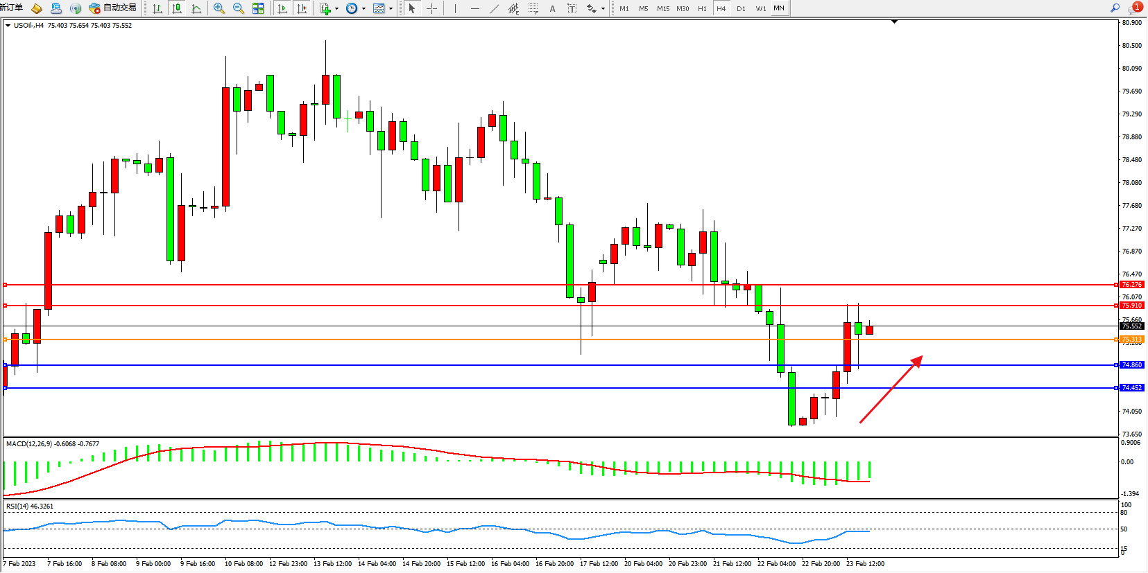 交易策略:75.313上方看涨,目标75.910、76.276
