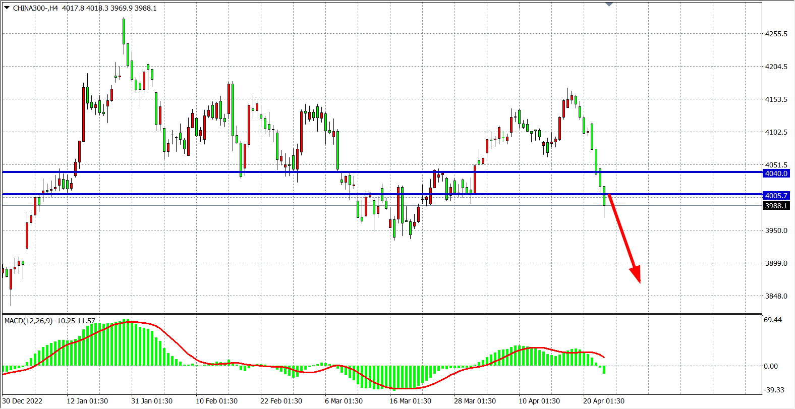 4小时图看,沪深300进一步走低,趋势延续空头,MACD量能下穿零轴,目前阻力已下移至4005附近,在4005之下继续看跌,目标3950-3900。