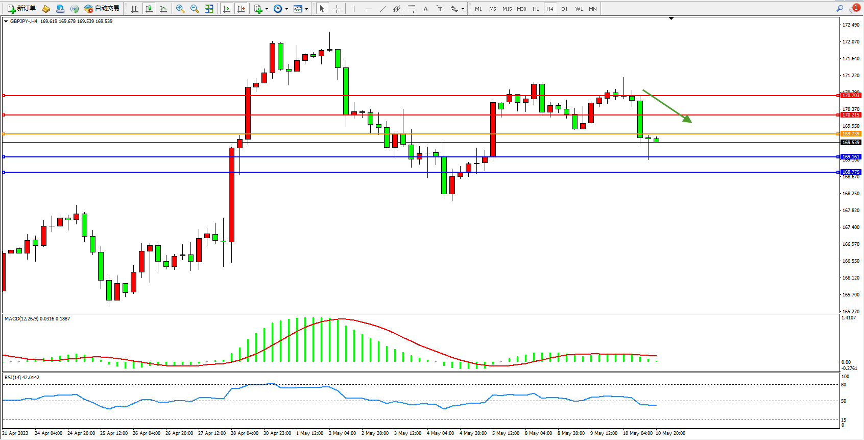 交易策略:169.739下方看跌,目标169.161 168.775