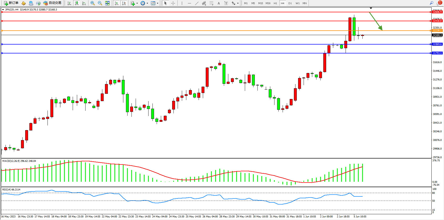 日经225指数6月5日(周一)收盘上涨683.28点,涨幅2.17%,报32207.50点。海外需求复苏,以及防疫限制进一步放宽后外国游客激增,日本5月服务业活动以创纪录的速度扩张。日本5月au Jibun Bank经季节调整的服务业采购经理人指数(PMI)终值从4月创下的前高55.4升到55.9。