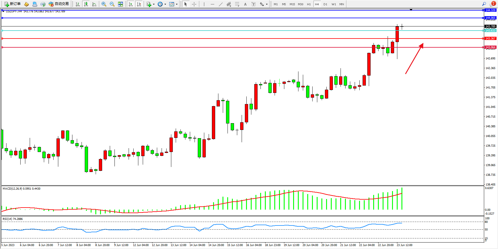 4小时图看:高位多头动力持续震荡上扬,短期看涨情绪依旧,市场整体看涨趋势依旧,MACD指标处于多头区域不断上行,RSI指标处于多头区域高位徘徊;