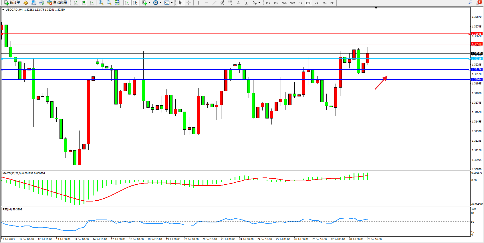 美元加元USDCAD——4小时K线图显示: