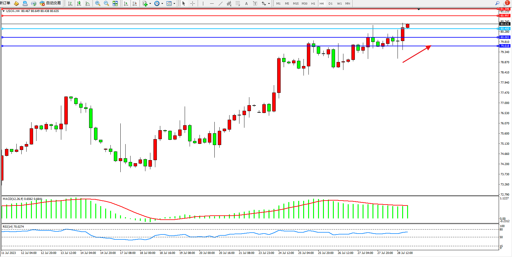原油USOil——4小时K线图显示:
