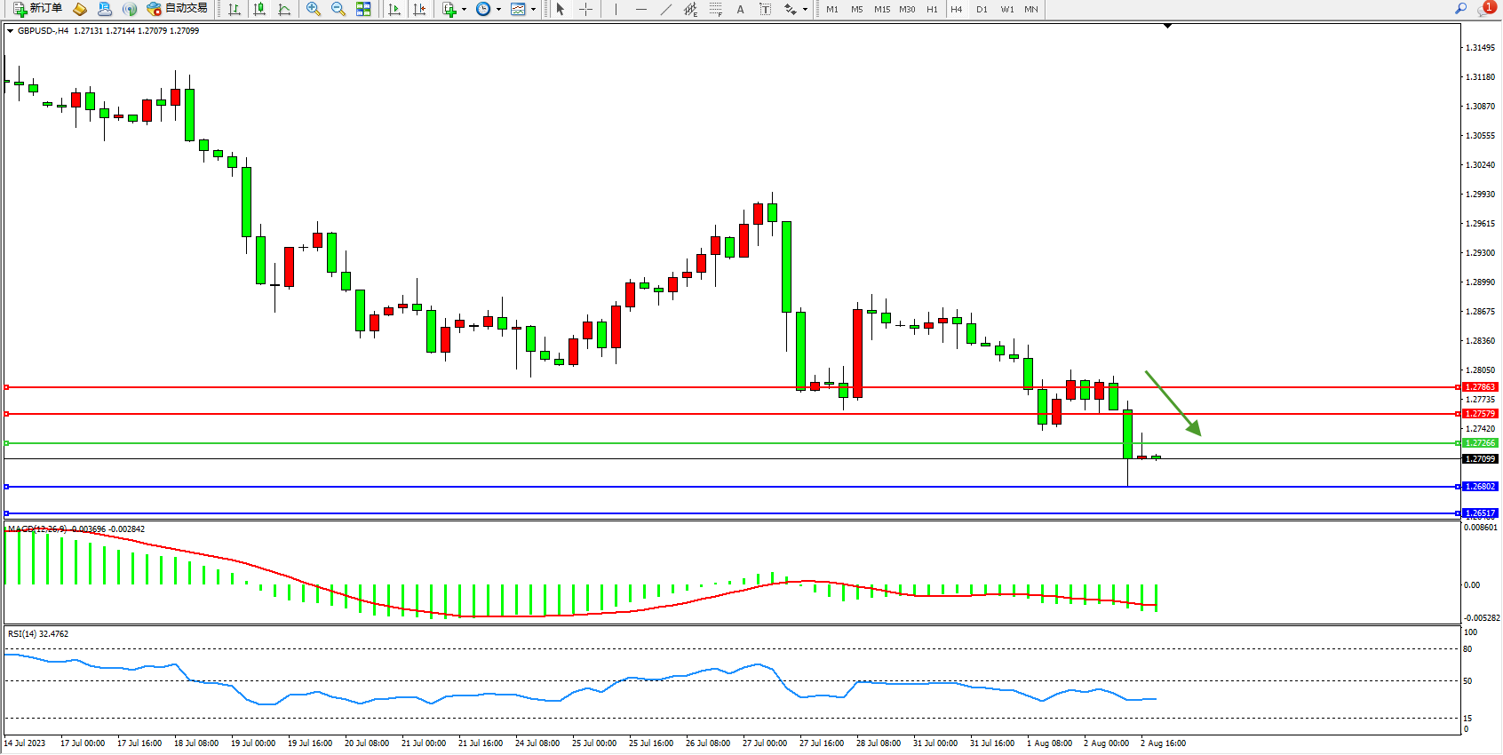 交易策略:1.27266下方看跌,目标1.26802 1.26517