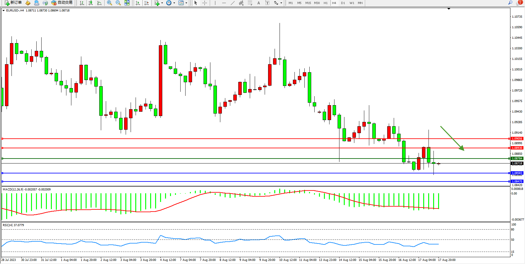 欧元美元EURUSD—4小时K线图显示: