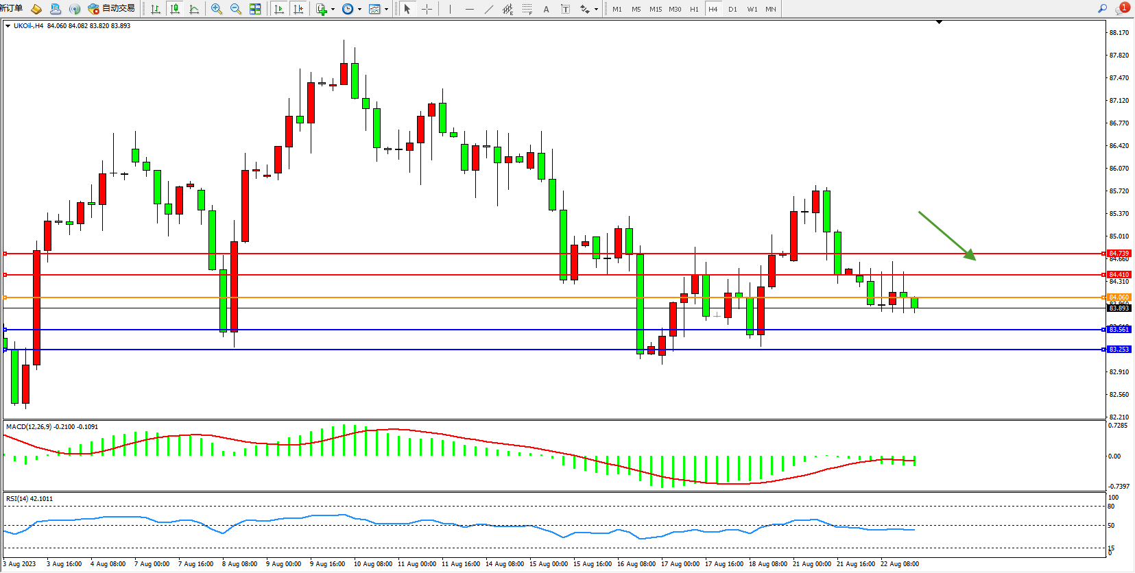 4小时图看:空头动力维持整理下移,短期跌势持续,市场空头情绪笼罩,MACD指标处于0轴线下侧弱势整理,RSI指标处于50均衡线下侧弱势徘徊;