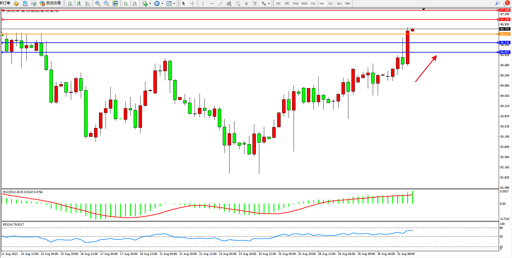 4小时图看:多头动力高位震荡攀升,短期有继续向上移动,市场多头动力尚未有止步迹象,MACD指标处于多头区域持续上移,RSI指标处于多头区域整理上行;