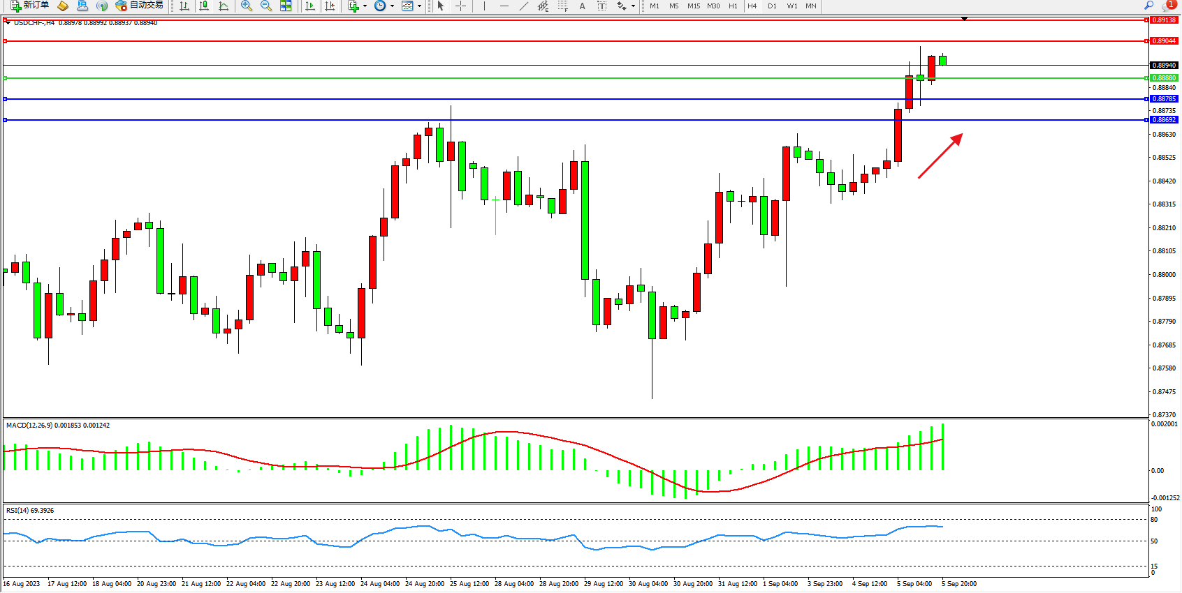 美元兑瑞郎维持0.88940附近震荡,全球经济增长的担忧导致美元走高,美债收益率也攀升,交易员认为美联储在9月19日至20日的政策会议上维持利率不变的可能性为93%,在今年剩余时间里利率维持在当前水平的可能性约为60%。