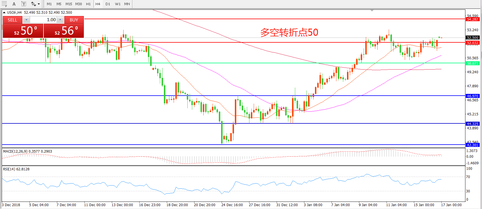 4小时图看,油价经过连续整理突破52美元,但短期内依然呈现震荡形态, 均线系统呈多头排列,但MACD红柱缩短,重点关注55周期均线支撑。