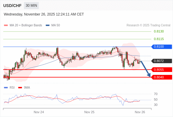 美元/瑞郎 当日内: 目标位为0.8055。