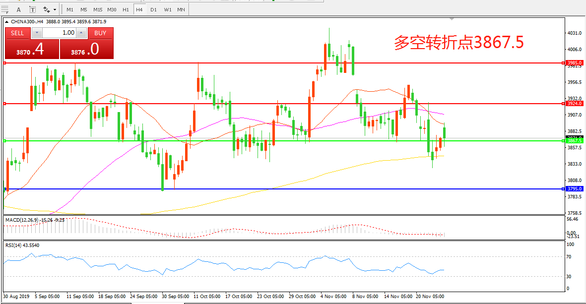 4小时图看,沪深300围绕3867.5附近宽幅震荡,200均线成为下方支撑,中期均线形成上方阻力,MACD绿柱增加,RSI指标走平,日内延续震荡概率较大。