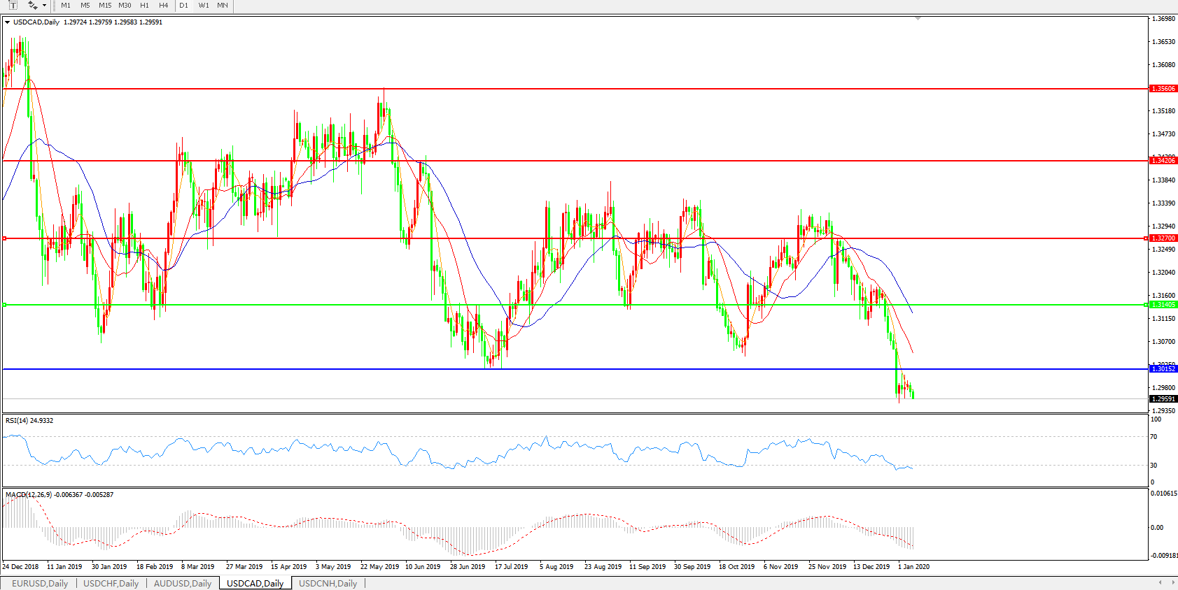 美元兑加元周一欧洲时段在反弹上攻1.30关口失败后再度走低,徘徊于近期低位水平。虽然,中东地缘局势动荡理应拖累商品系货币走软,然而,中东乱局令油市供应前景充满变局,却令NYMEX油价跳涨至2019年4月底以来的高位,这令与油价高度关联的加元也重新受到提振; 与此同时,美元指数在上周五美国ISM制造业数据继续低迷之后再陷颓势,投资者纷纷押注美联储在年内仍会维持宽松基调。并且业内机构对于美国经济前景也不甚乐观,这令美元在周一进入欧市后重新加速下跌,非美货币普遍得到提振; 这使得过去五周以来美元兑加元的跌势仍在延续,下方的支撑仍下看上周二(2019年12月31日)的低点1.2952。市场目光正转向本周五美加两国即将发布的12月就业数据,来判断行情将延续抑或反转