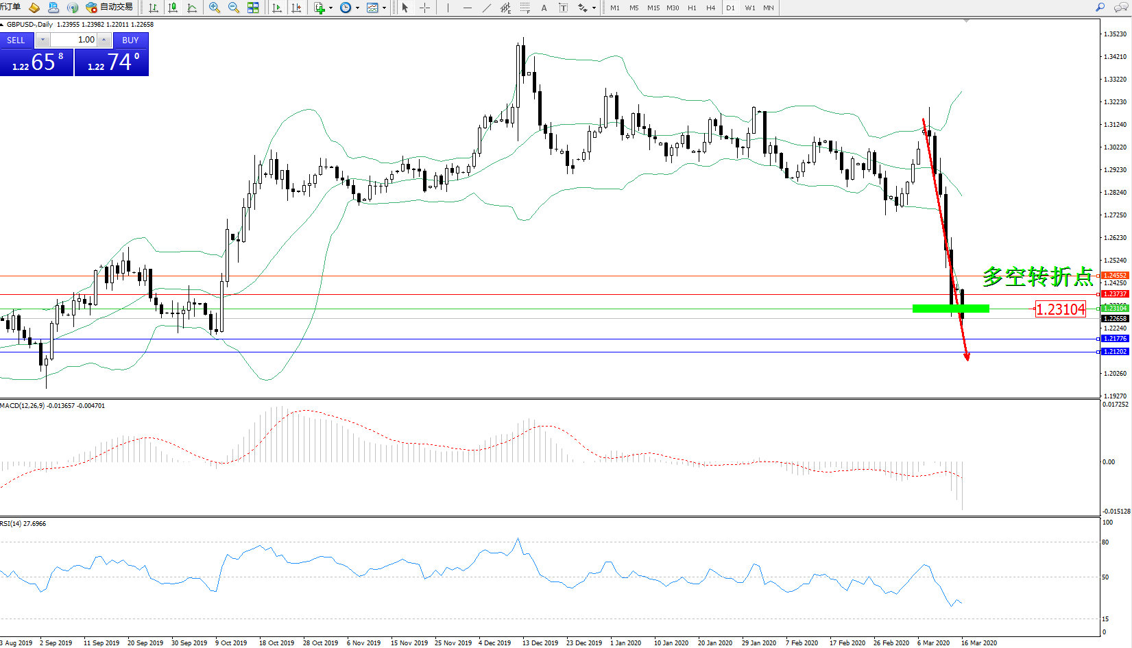 交易策略:1.23104下方看跌,目标1.21776、1.21202