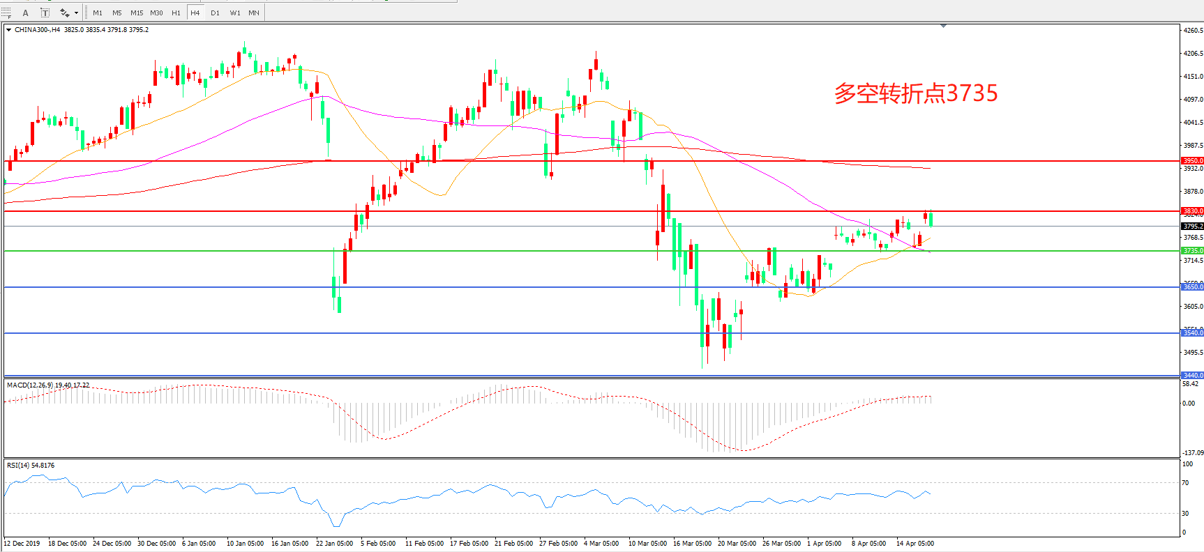 4小时图看,沪深300延续高位震荡,整体波幅不大,短期均线拐头向上,有形成金叉迹象,MACD红柱增加,RSI指标走平,日内延续上行概率较大。