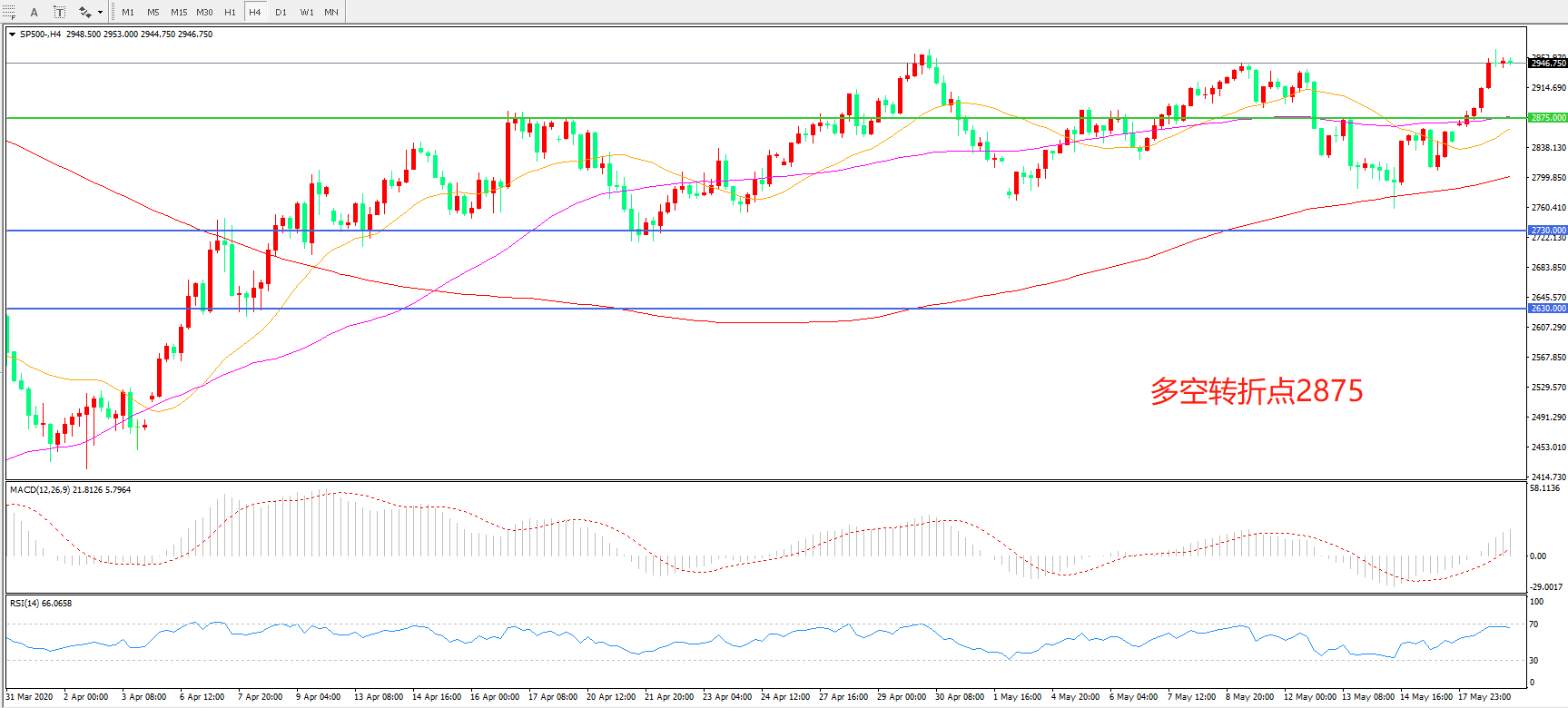 4小时图看,标普500阳线连续拉升,整体表现回暖,2950一线成为再次成为争夺焦点,均线系统拐头向上, MACD红柱增加,RSI指标走平,日内延续震荡概率较大。