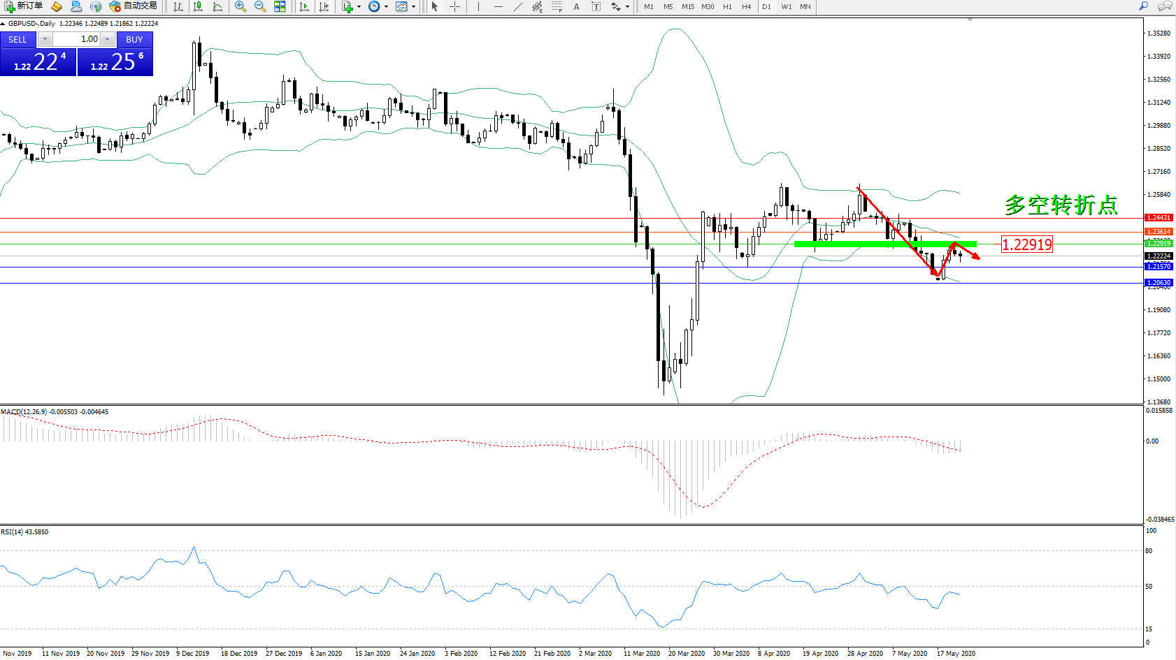 交易策略:1.22919下方看跌,目标1.21570、1.20630
