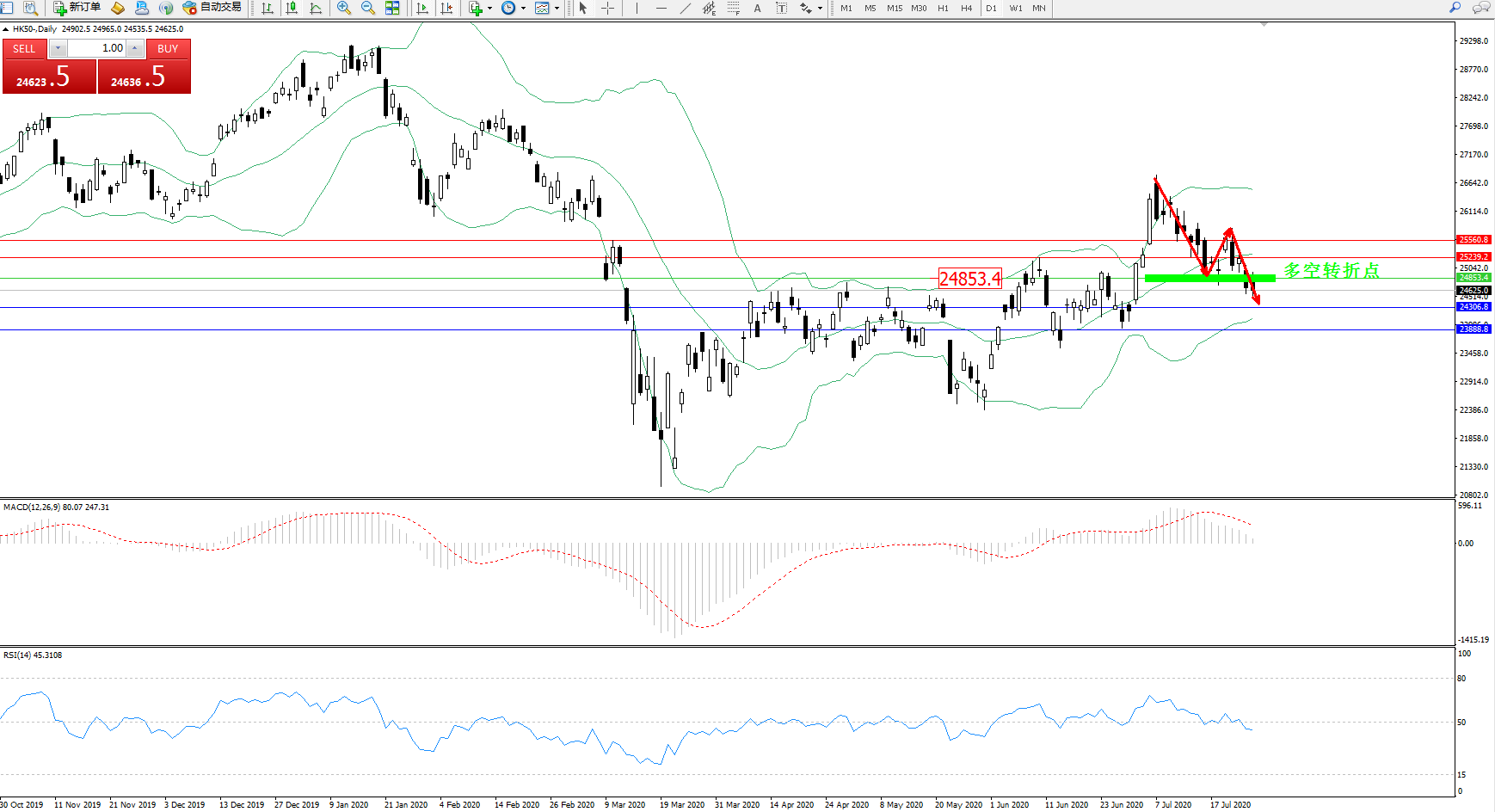 技术点评:高位空头动力呈阶梯式震荡回撤下移至布林带指标中下轨区间震荡,有进一步回撤下移态势,布林带指标呈收口走势后有开始平移态势,关注24853附近关键转折点,该位正式前期压制节点,MACD指标空头力度持续弱势震荡下移至0轴线附近徘徊,RSI指标处于50均衡线附近徘徊数日后出现回撤向下移动态势;