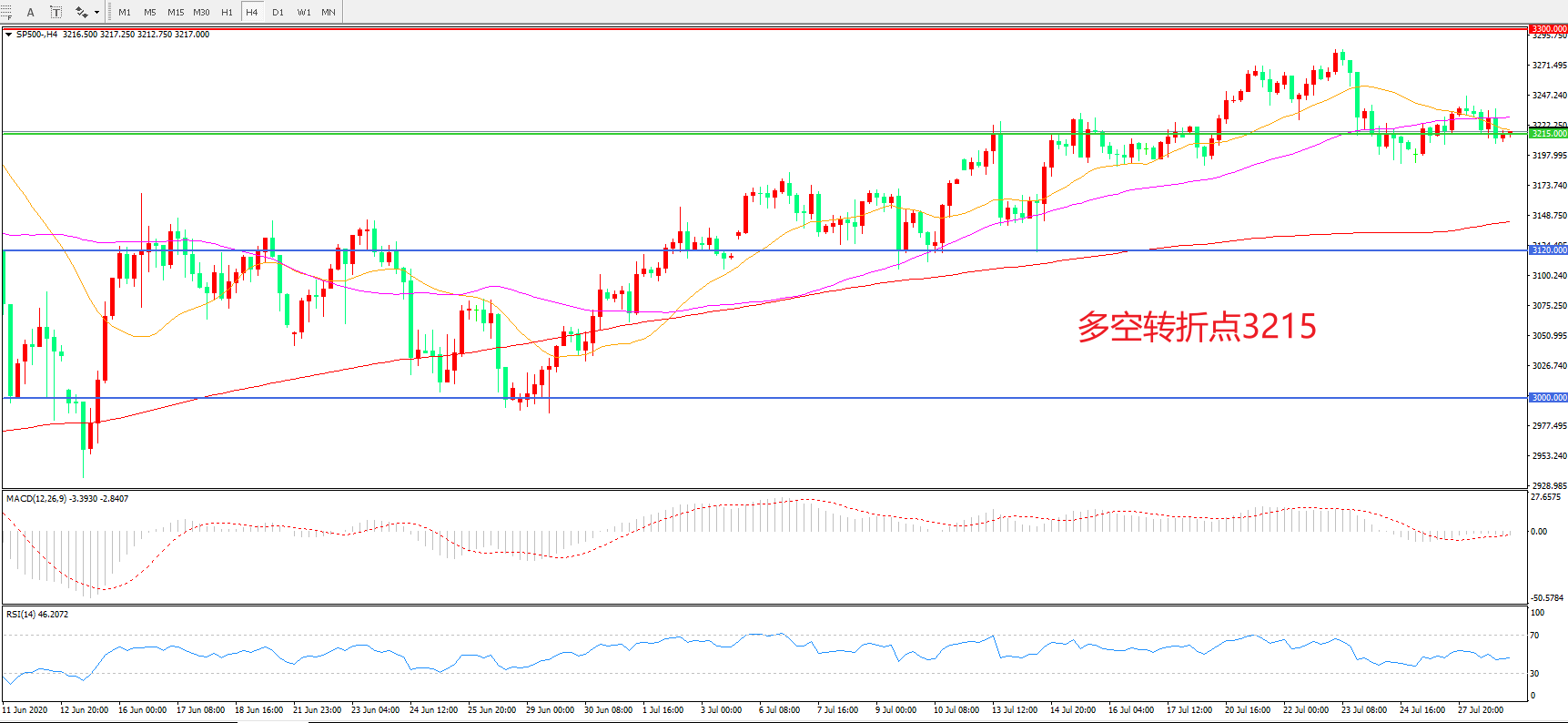 周二(7月28日),由于企业财报疲软及对经济刺激方案达成信心不足,美股三大指数集体收跌,标普500震荡下行,收报3215点。科技股表现低迷,奈飞和Facebook跌1.4%,苹果跌1.6%,市场目前都在等待美联储货币政策决议,鲍威尔的表态对市场后续走势影响巨大。