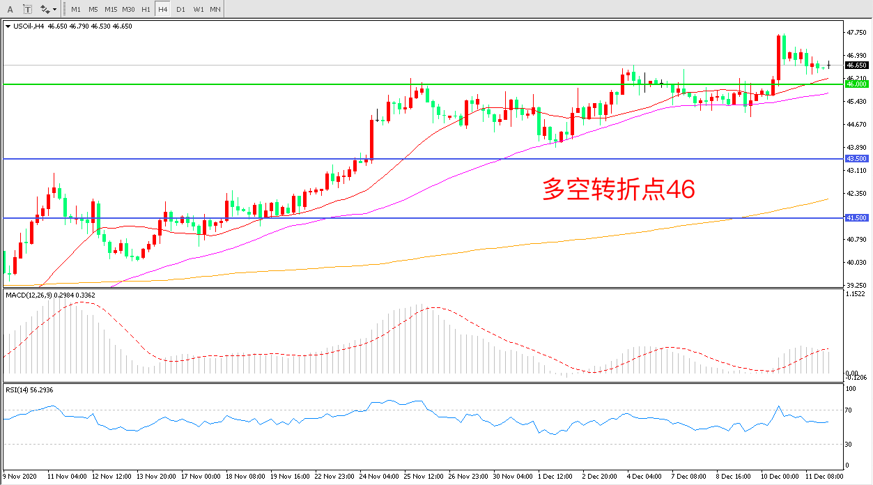 4小时图看,油价长阳突破后出现短暂回调,近期涨势有所放缓,但整体价格区间依然运行在46美元之上,均线系统成为下方支撑,MACD红柱减少,RSI指标走平,日内震荡上行概率较大。