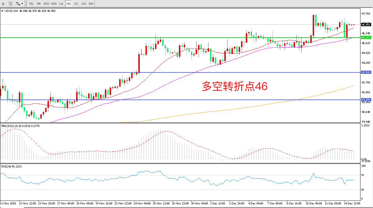 4小时图看,油价先跌后涨,整体表现较为强势,46美元支撑比较稳固,均线系统呈多头排列,MACD红柱减少,RSI指标走平,日内震荡上行概率较大。