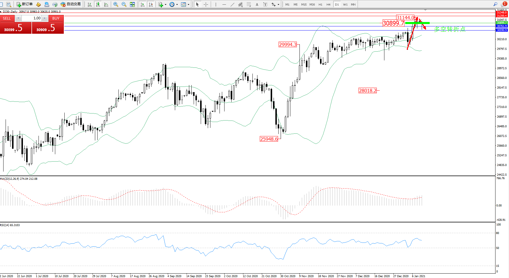 道琼斯指数DJ30—— 日K线图显示: