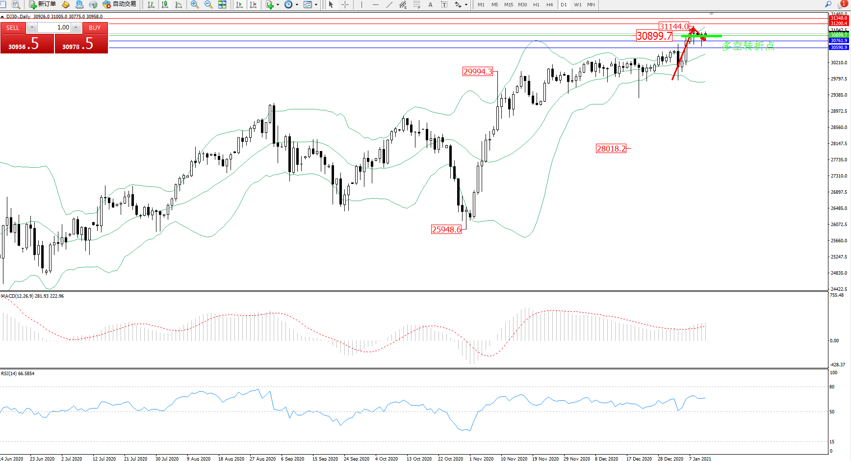 道琼斯指数DJ30—— 日K线图显示:
