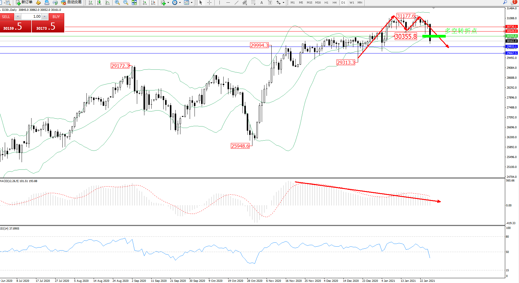 道琼斯指数1月27日(周三)收盘下跌633.00点,跌幅2.05%,报30304.09点。美股收盘,三大股指低开低走,美联储公布最新的1月利率决议,基准利率维持在0%-0.25%不变,符合市场预期;美联储利率决议后,美元指数保持坚挺,现报90.56,涨0.42%;之前美国联邦公开市场委员会(FOMC)维持利率和资产购买步伐不变,符合市场预期,并指出经济和就业复苏的速度有所放缓;美联储将致力于使用各种工具支持经济,直到经济进一步大幅增长。美联储将超额准备金率(IOER)维持在0.1%不变,将继续每月购买800亿美元的国债和400亿美元的住房抵押贷款支持证券(MBS)。美联储将停止定期提供一个月期限的回购操作,2月9日后将不再提供定期的一个月期回购操作。新冠病毒对经济前景构成显著风险,经济的疲软集中在受疫情影响最严重的行业,经济发展的道路将在很大程度上取决于疫情的进程和疫苗的进展。美联储认为经济和就业复苏步伐温和。公共健康危机继续拖累经济活动,对经济前景构成相当大的风险。