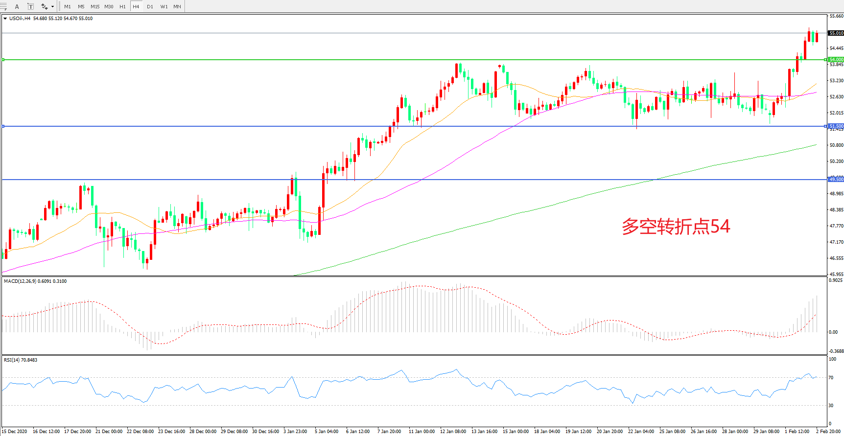 4小时图看,油价连续拉升,整体表现偏强,54阻力被快速突破,多头趋势正在形成,MACD红柱增加,RSI指标向上,日内延续上行概率较大。