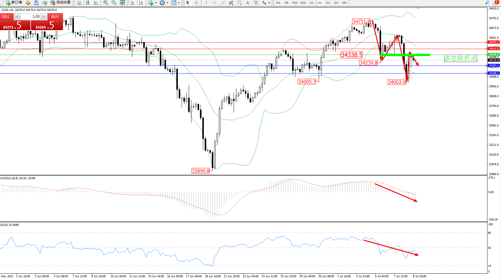 技术点评:高位空头动力呈阶梯式震荡下行,低位抵达34002位置后快速回升,高位延续布林带指标中下轨区间持续下探中,布林带指标呈收口走势向下移动中,MACD指标处于0轴线下方空头区域维持窄幅整理平移,RSI指标处于50均衡线下方空头区域维持窄幅震荡中;