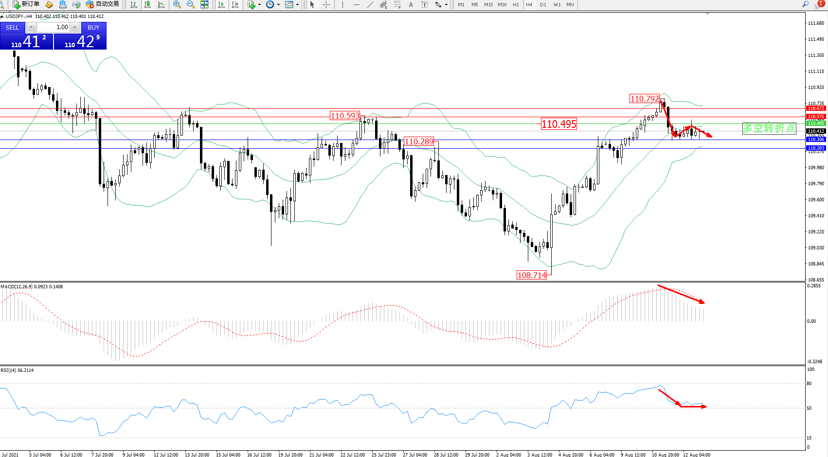 技术点评:多头动力延续布林带指标通道中上轨区间强势拉升上扬后,高位抵达110.792位置遇阻回撤,触及布林带指标中轨位置后维持整理平移,布林带指标呈收口走势中,MACD指标处于多头区域持续拉升后高位开始转势下行,RSI指标纠结于50均衡线上方弱势整理平移;