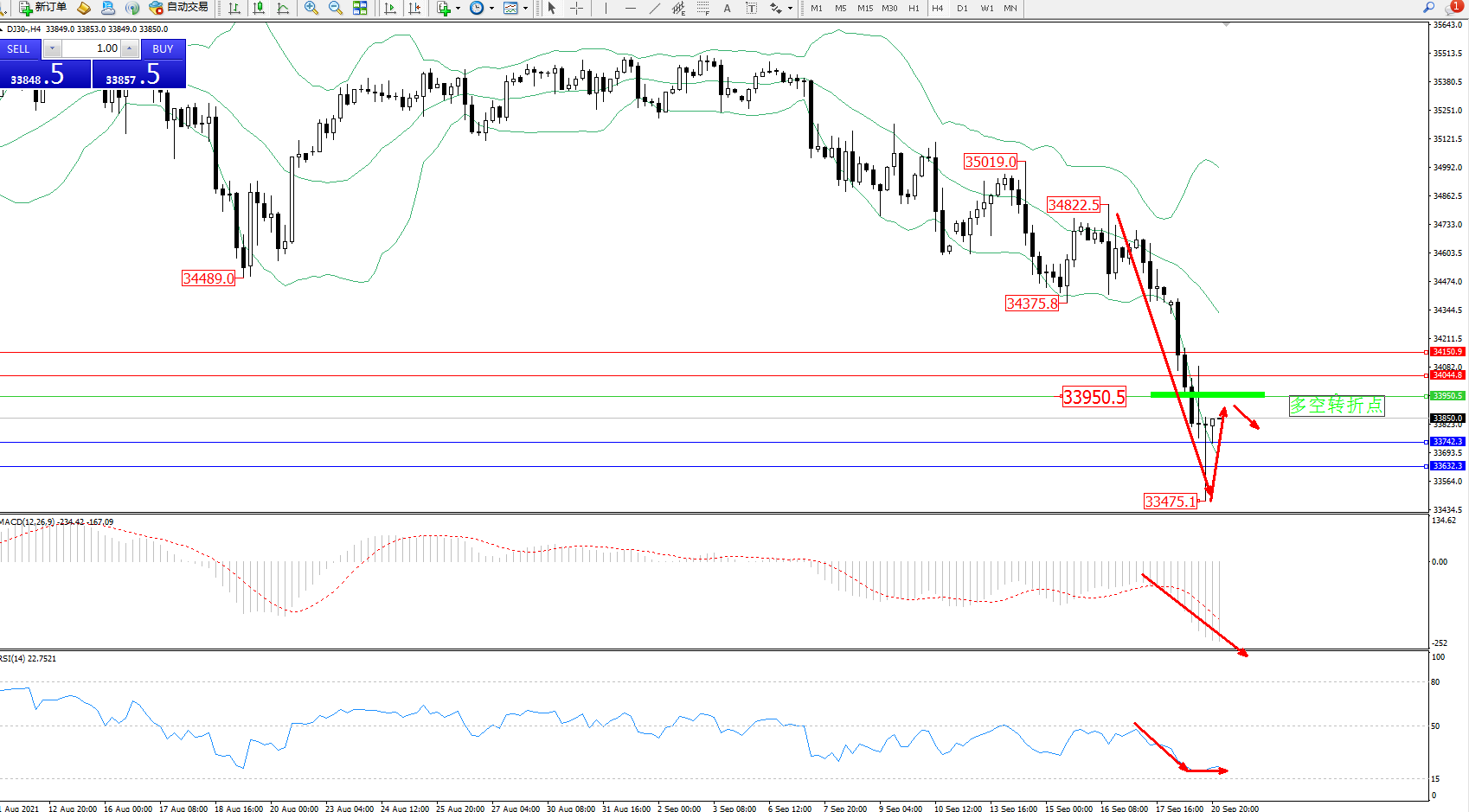 交易策略:33950下方看跌,目标33742、33632