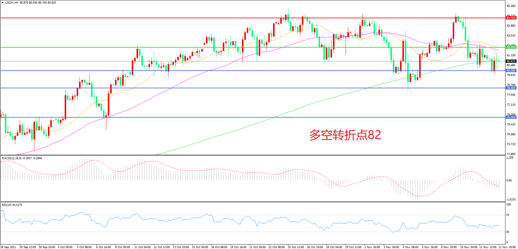 4小时图看,油价破位大跌后于80美元附近企稳,但短期均线逐渐下压成为阻力,82美元成为多空分水岭,MACD绿柱增加,RSI指标走平,日内震荡下行概率较大。