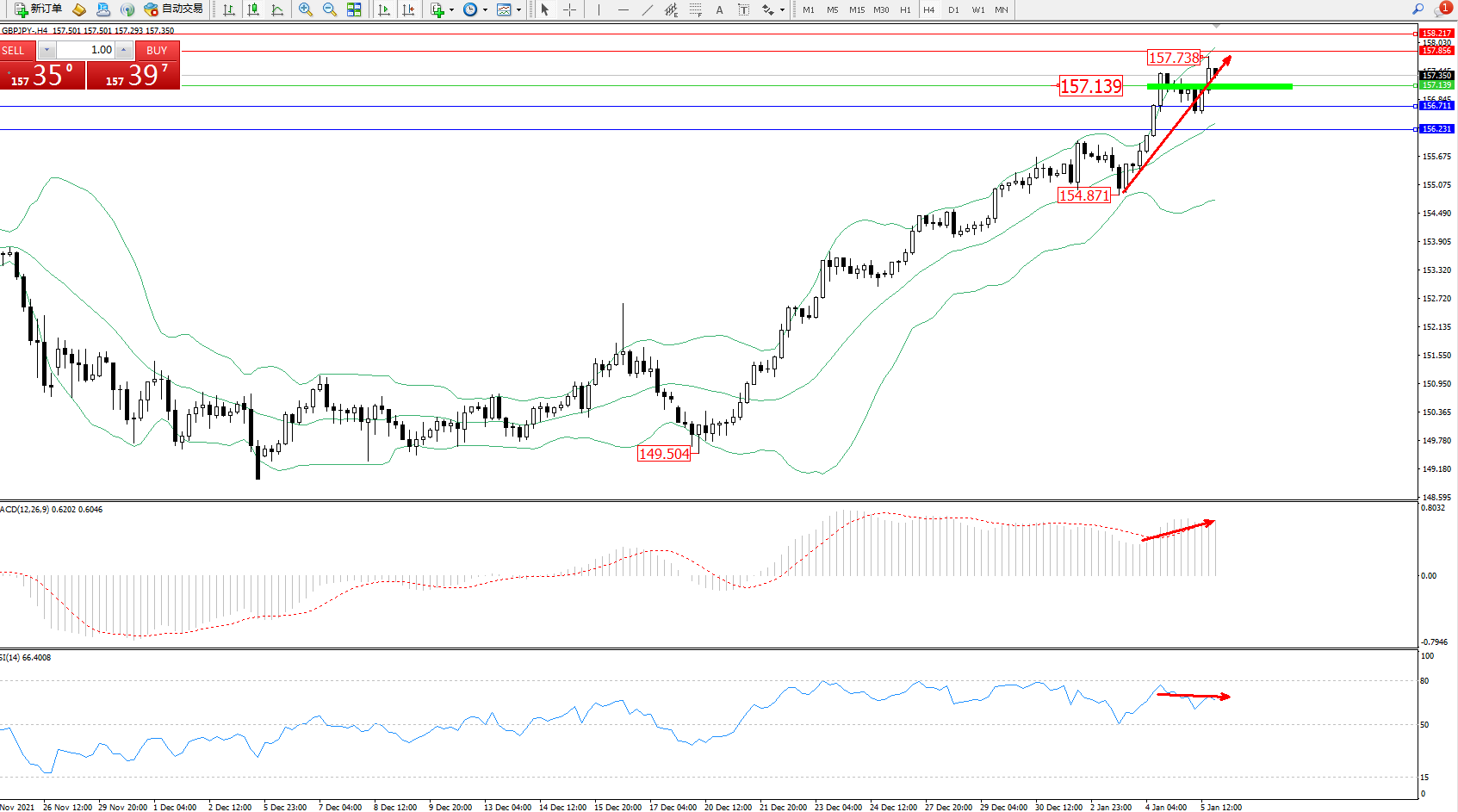 技术点评:多头动力延续布林带指标通道中上轨区间持续震荡上扬,高位抵达157.738位置附近遇阻震荡,短期多头动力有继续攀升态势,布林带指标呈张口走势后开始收口持续上移中,MACD指标处于多头区域维持震荡向上徘徊,RSI止步处于多头区域维持窄幅震荡中;