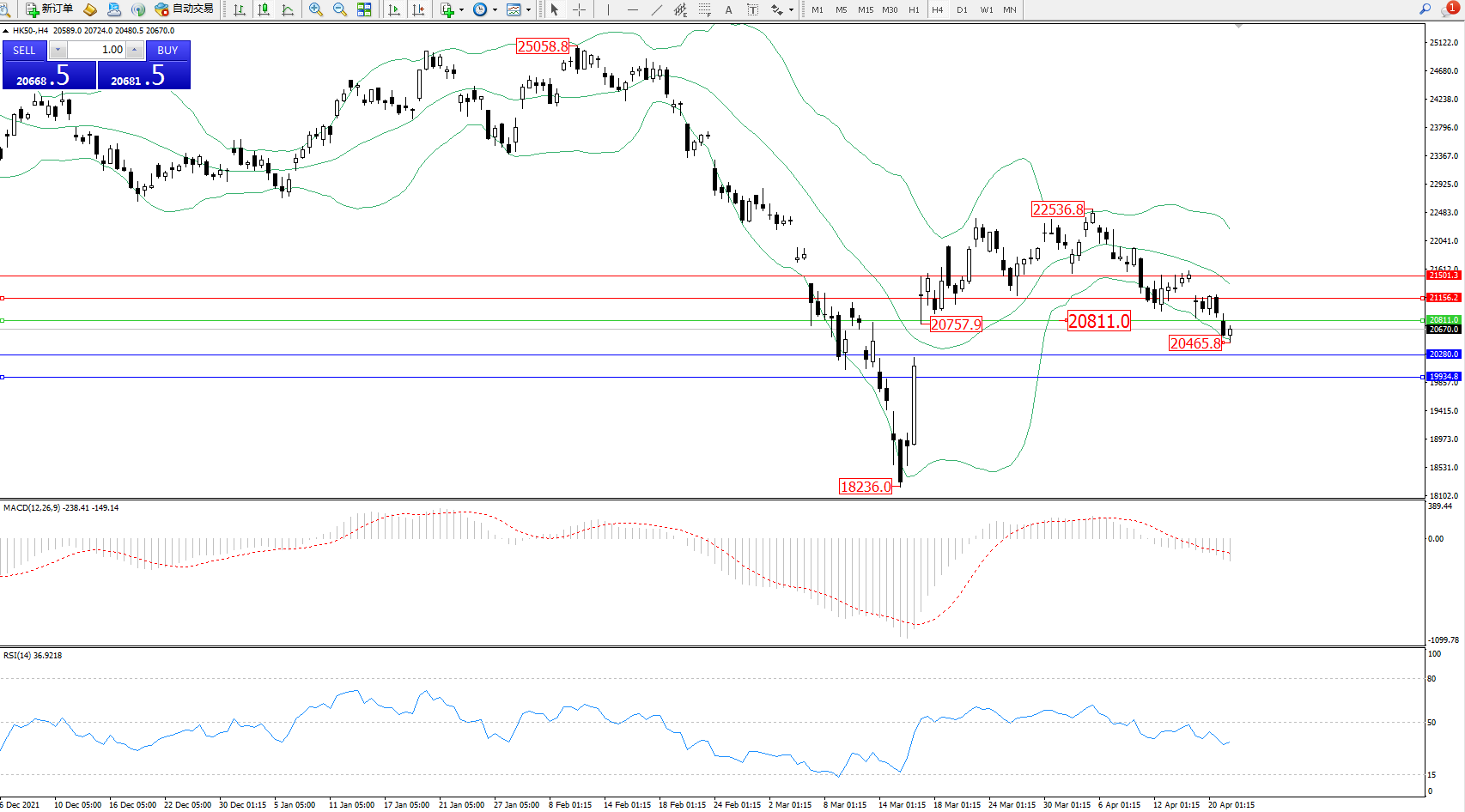 恒指HK50 ——4小时K线图显示: