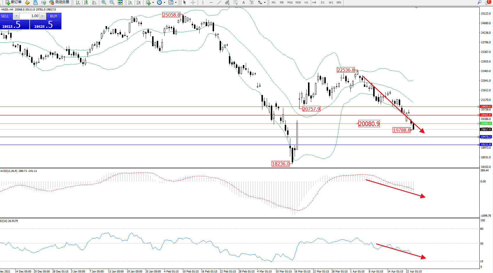技术点评:空头动力延续布林带指标通道下轨附近持续震荡下行,低位抵达19788位置节点后有继续下行态势,布林带指标呈张口走势不断扩大,MACD指标处于空头区域维持震荡下行中,RSI指标处于50均衡线下侧维持震荡向下移动中;