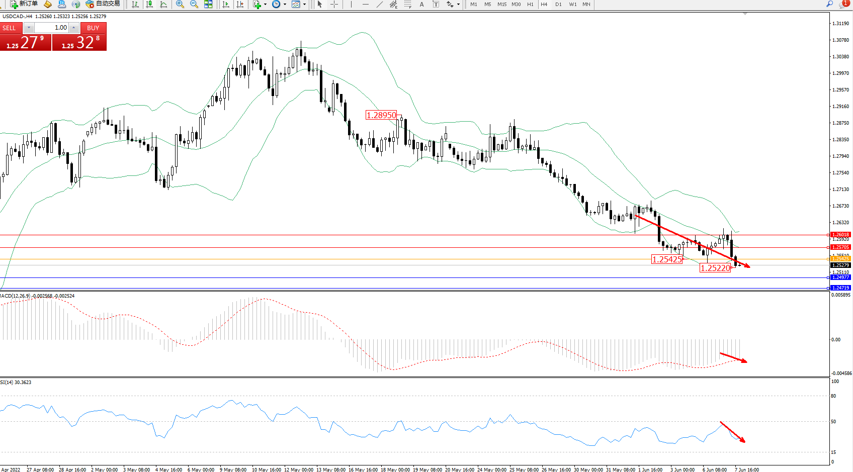 技术点评:空头动力延续布林带指标通道中下轨区间持续震荡下行,低位抵达1.25220附近节点后整理,短期空头动力有继续向下移动态势,布林带指标低位呈收口走势后开始有张口迹象,MACD指标处于空头区域维持震荡,RSI指标处于空头区域维持震荡向下移动;