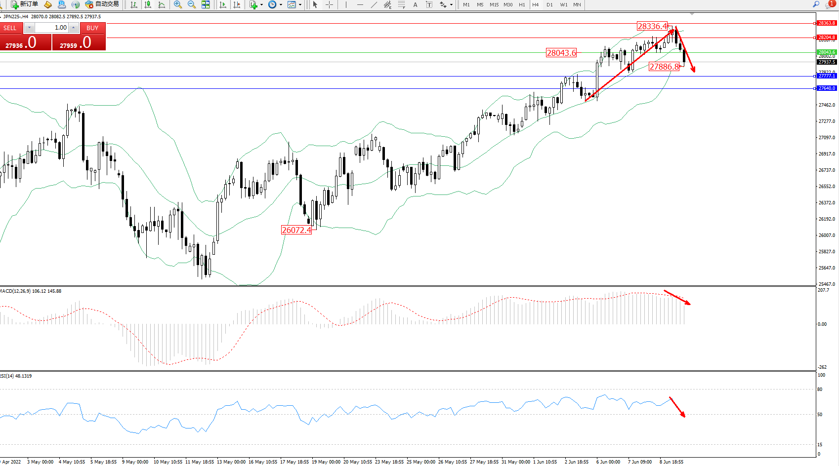 技术点评:多头动力延续布林带指标通道中上轨区间持续震荡上扬,高位抵达28336附近节点后遇阻回撤,急速下挫至布林带指标下轨27886附近节点整理,空头动力伺机入场,布林带指标高位开始张口,MACD指标处于多头区域维持弱势下移,RSI指标处于多头区域急速下挫至50均衡线附近徘徊;
