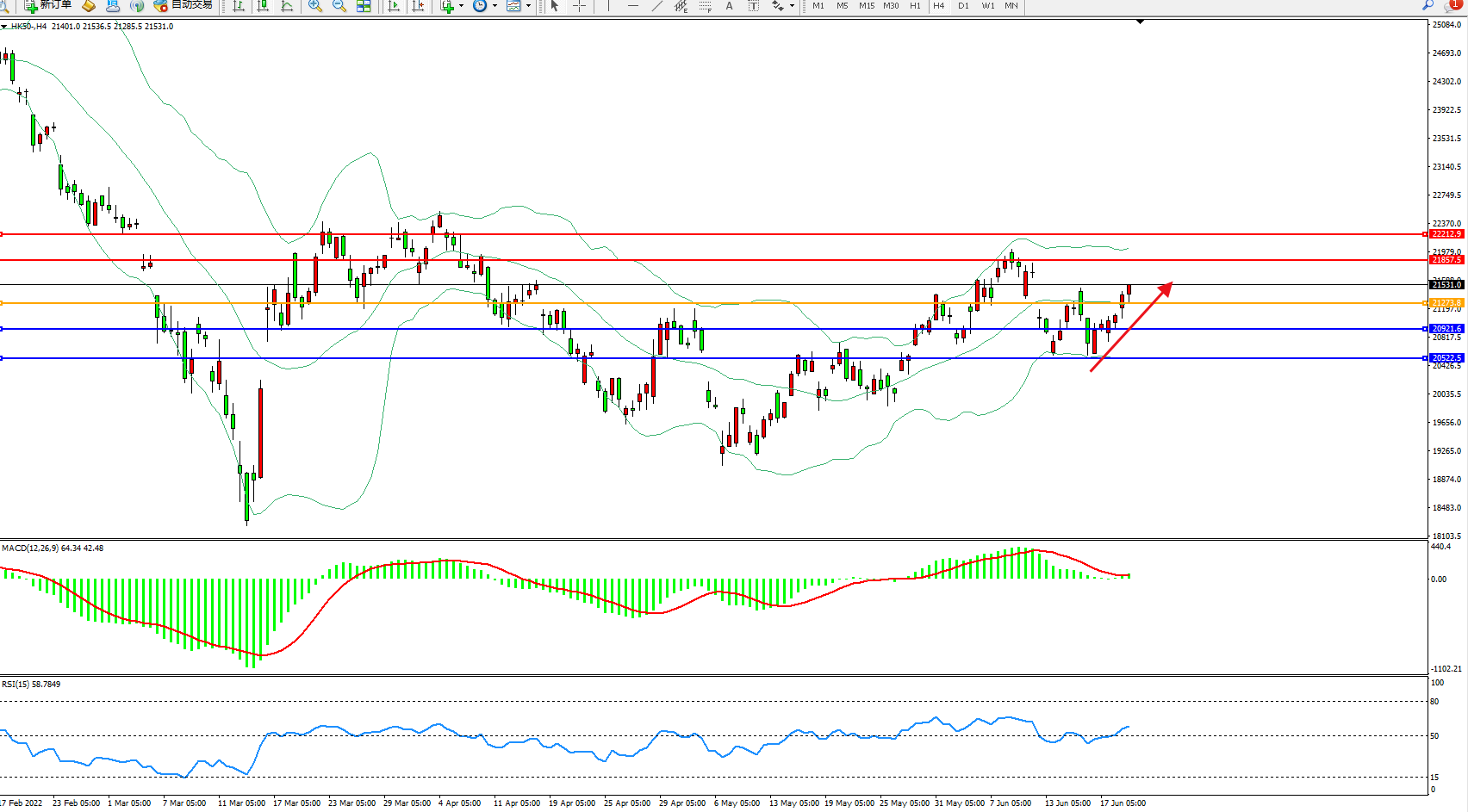 4小时图看:长时间维持在布林带指标通道中下轨区间窄幅震荡后,多头伺机入场,强势突破中轨进入中上轨区间震荡拉升,布林带指标呈收口平移中,MACD指标处于0轴线上側弱势徘徊,RSI指标处于50均衡线附近窄幅整理后开始上移;
