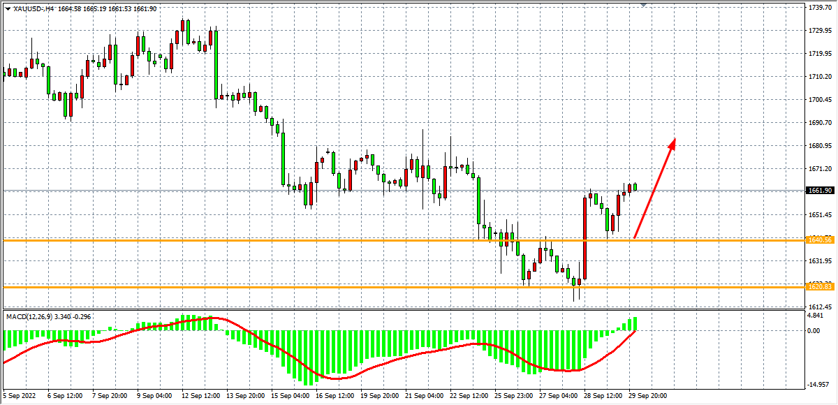 4小时图看,金价回调1640后受到支撑延续反弹,在底部之上走高,MACD于零轴之上也开始小幅放量即,显示行情延续反弹需求,日内依旧在1640之上维持看涨,目标1670-1690。