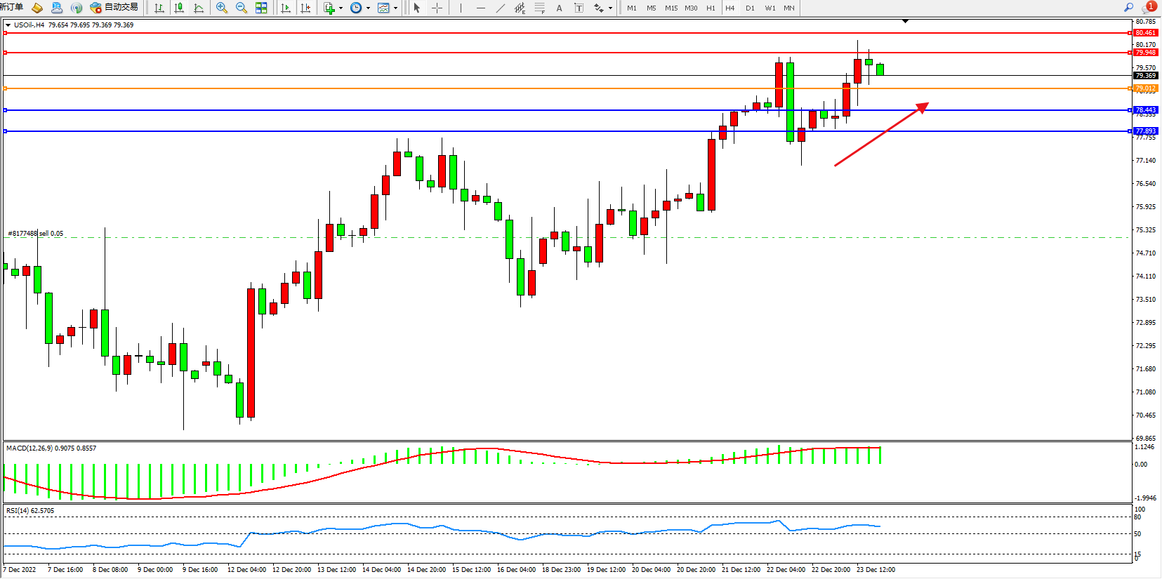 原油维持79.369附近震荡,机构预测俄罗斯12月石油出口可能下降20%,美国正准备应对冬季风暴,而俄罗斯原油出口将下降,这将给取暖油需求的上升增加压力。周一圣诞节休市一日。