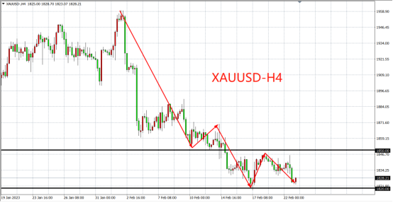 4小时图看,金价维持进一步跌势,但相比此前的下跌速度和角度,本周的下跌明显力度有所缩减,为空头放缓的表现,当前短期行情进入方向选择,区间位于1820-1846,在此区间内首选高抛低吸为主,若跌破下方1820则空头加速,往下看至1800-更低;若后市意外上破1850则底部形成,后期上看1880-1900一线。