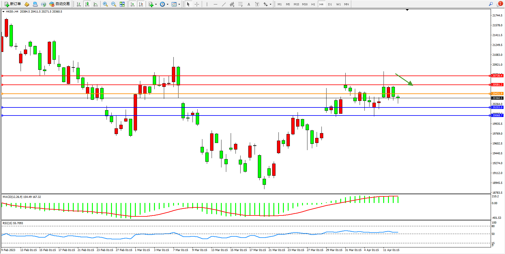 4小时图看:高位空头震荡回撤,高位双顶形成,短期有继续下移迹象,MACD指标处于多头区域维持整理,RSI指标处于50均衡线上側徘徊;