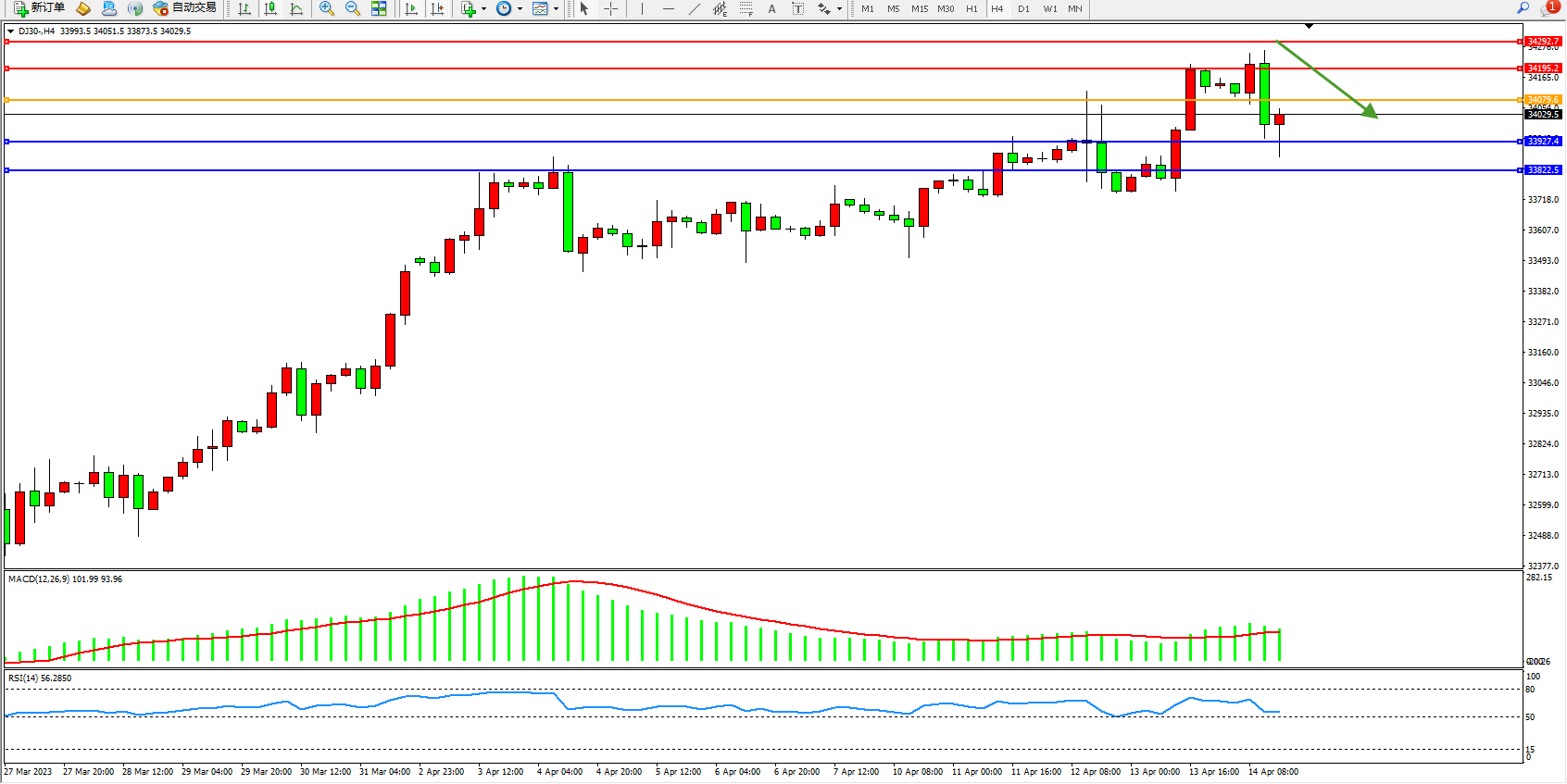 道琼斯指数4月14日(周五)收盘下跌144.38点,跌幅0.42%,报33885.31点;美国3月零售销售降幅超过预期,消费者减少购买汽车和其他大宗商品,这表明由于利率上升,经济在第一季度末失去动力。