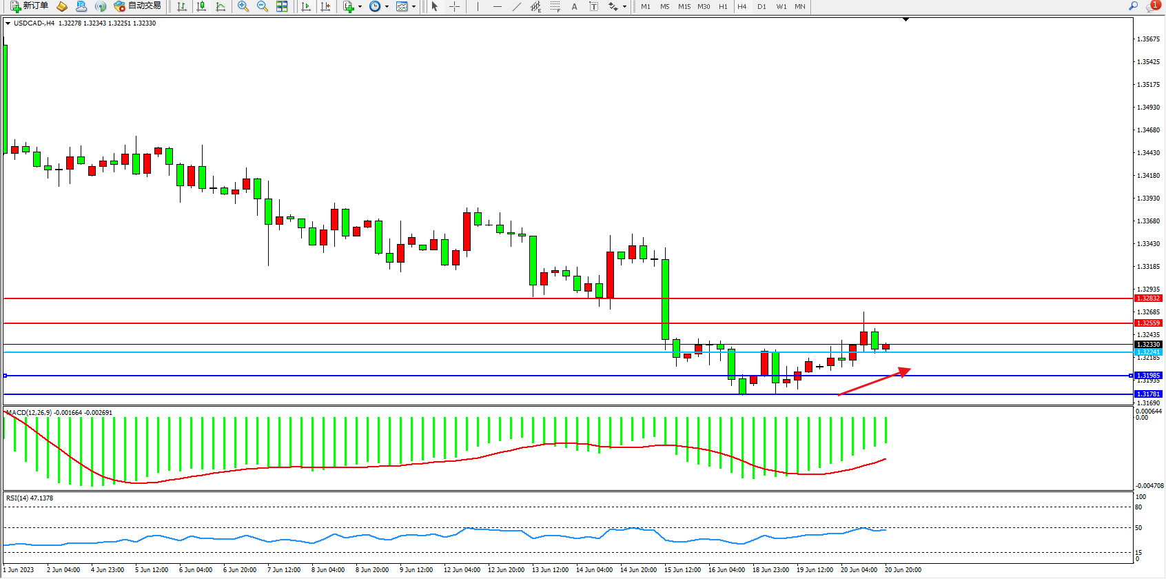 美元加元USDCAD——4小时K线图显示: